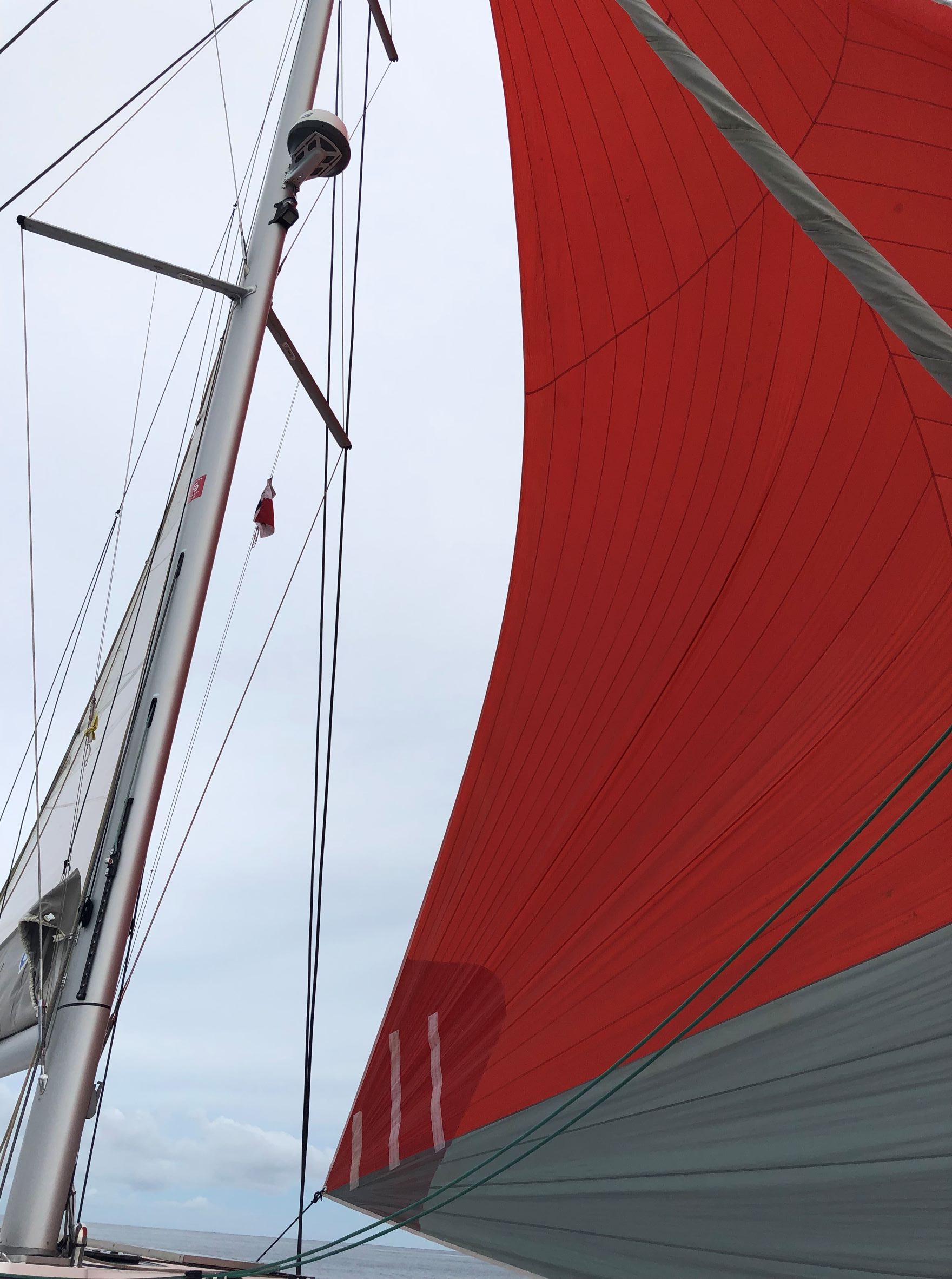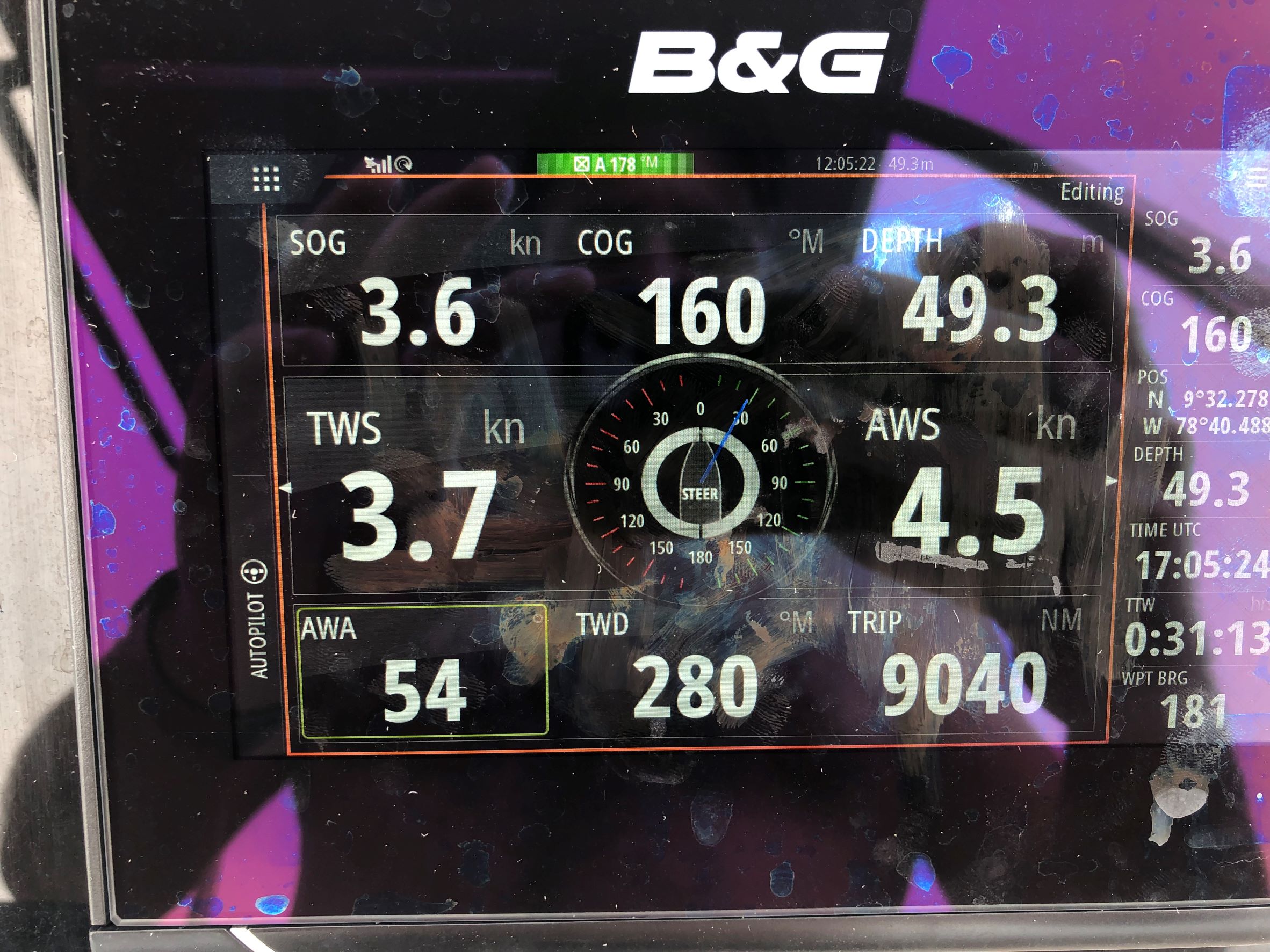 I’m very impressed with the light wind performance of the boat. Between islands, our speed (SOG – Speed Over Ground) was matching the wind speed (TWS – True Wind Speed) which is impressive for a racing boat let alone a family cruising boat!