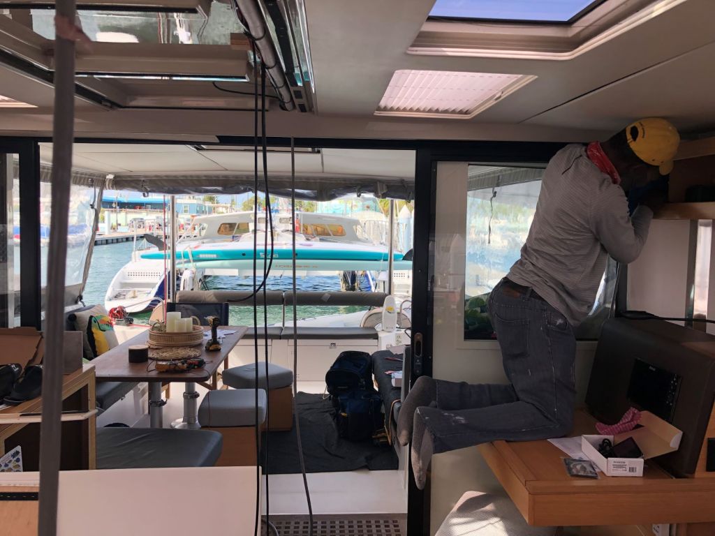 “You aint got enough pan-nals mon, you aint got regulators on your alternators (er haven’t I? I felt really inadequate now), I can’t believe they’re not already fried. Your water heater is cooked, you need a shore power connector for the US and 4 of your fuses are blown. Basically, you need my help mon, I’ll make some calls”.  And so started our major electrical upgrade which was finally completed one hour before we left the dock three weeks later at which point we had a working water heater, a beautiful set of 3 new slimline solar panels on the coach roof adding 50% more solar generation, a new shore power plug and, best of all, a new friend.