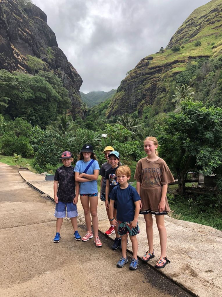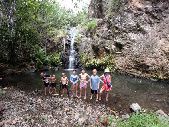We arrived at Atuana Bay to find our old friends on the Kiwi boat, Waterhorse anchored next to a Kiwi / USA boat called Far Out that would soon become new friends. “We’re just off for a hike if you want to join us” shouted over Annelise as we anchored behind them, so we grabbed our hiking shoes, jumped in the dinghy and met them ashore. It was a beautiful walk, firstly around the stunning bay and then over a gentle hill through a farm to the windward beach where some serious surf was breaking. The kids renewed their friendship with the Waterhorse kids and made new ones with the Far Out ones whilst we stocked up on all manner of fresh fruit and vegetables from the farmer. You basically fill up a bucket with whatever produce you want straight off the plants in some cases and then he weighs the whole lot in one go and makes up / calculates a price.