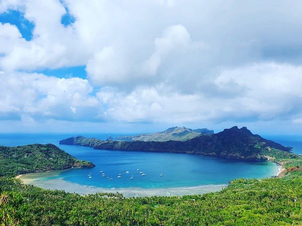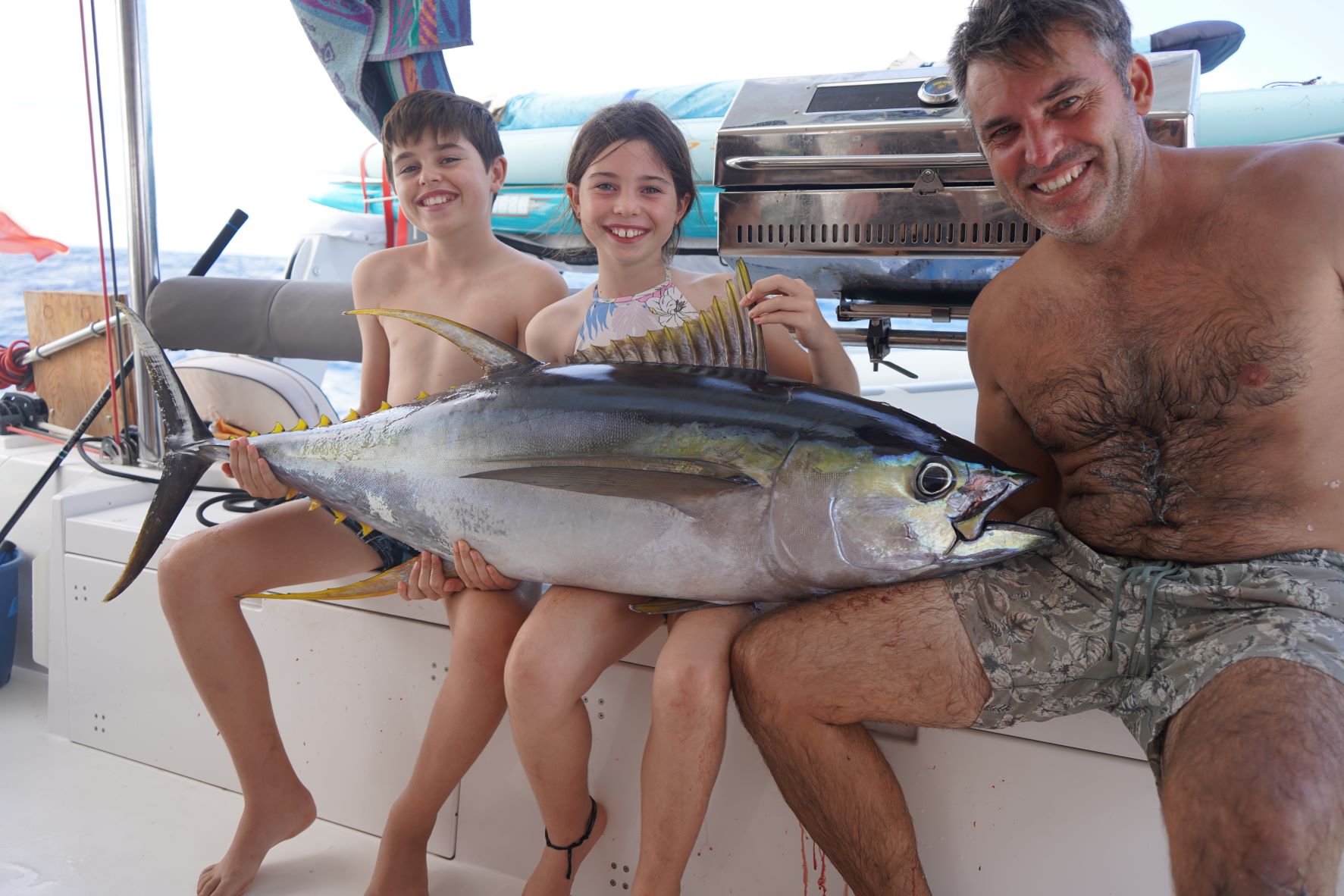 Next stop was the largest town in the Marquases, Taiohae, where we finally officially checked in. As I was dealing with the paperwork the rest of the crew explored the town. Finding myself alone I wondered up a side street and saw a chandlery full of lots of things I needed for the boat (yay!) and, next door, a tattoo artist (interesting). Before I knew it I was sitting down with Danny, one of the island’s best tattoo artists being interviewed about my life. “I don’t want to know everything you have done, I just want to know who the real Alex is, man. What are your passions?”. I quickly stopped listing off some of the projects I’d worked on and instead starting talking about how rewarding it was during this trip to have so much time with my children at their age, how proud I was of my wife and how much I loved to travel, swim, sail and fish. Only after listening intently through all of this did we discuss what the tattoo might look like and where it should be placed. He scoffed when I suggested something small. “You’re a man, man! You want a man sized tattoo or a woman sized one?”. Er, what about a small man? I thought. “Fair enough, what do you think about a manta on the calf then?” is what I actually said. “Yeah, man, I have some ideas already for that one” and he started sketching some concepts. Minutes later, I was back on the street again having swapped whatsapp numbers with Danny and a booking for 2 days’ time for my session. Lottie grinned when I relayed all this, her nerdy engineer husband was just about to become, well maybe not cool as such but definitely a little less nerdy.