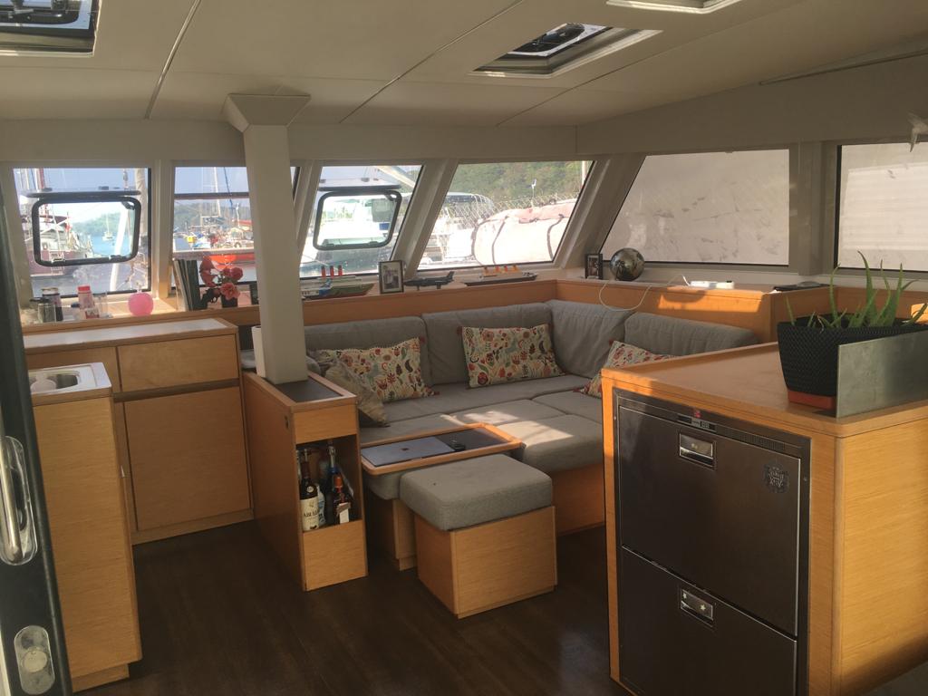 We have the three cabin version of this model. The “owner’s hull” has a double cabin at the stern (back), office area in the middle and head (bathroom) up in the bow (front) with separate shower area. The other hull has a cabin and head at each end with a shared shower in between. The area between the two hulls is taken up with the saloon (living area), galley (kitchen) and navigation area. This opens out to a large covered cockpit and there are twin helms (where you steer the boat) right at the back of each hull.