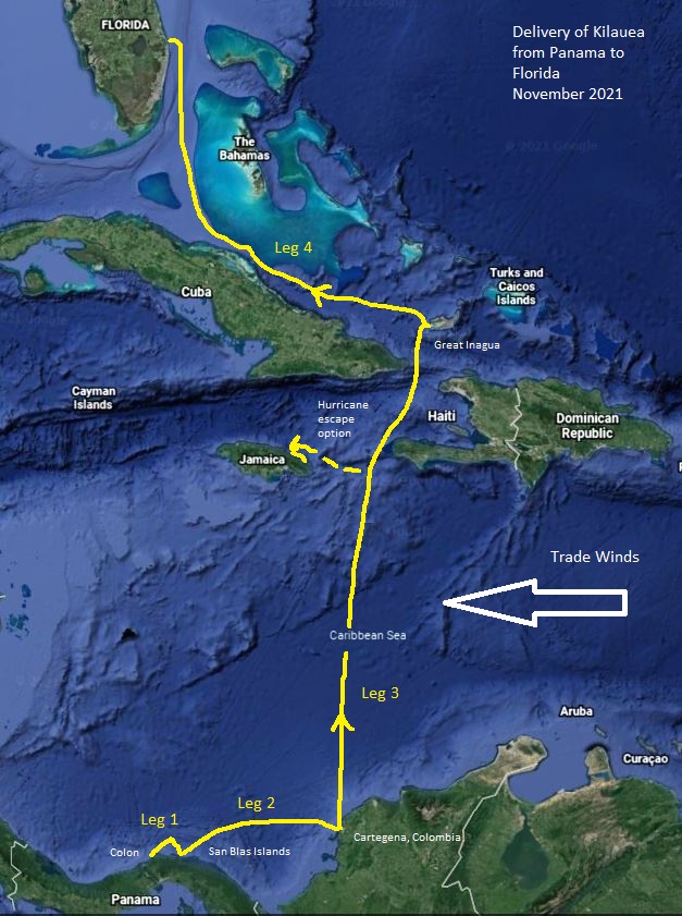 Getting the boat to Florida from Panama will be challenging given the direct route is against the prevailing trade winds and ocean swells for much of the way. The plan is to do this in November 2021 which is at the tail end of hurricane season and therefore careful weather monitoring will be vital. For this trip we plan to have short hop to the San Blas Islands (leg 1) go east as far as Cartagena in Colombia (leg 2) and then due north through the Windward Passage between Cuba and Haiti entering the Bahamas at Great Inagua (leg 3). From there we will ride the Gulf Stream and trade winds all the way to West Palm Beach, Florida (leg 4) where we have booked a marina. We have decided against the route West of Cuba due to increased likelihood of hurricanes in the Western Caribbean at this time (thanks for the tip Jess!). We will have “bail out” options in Jamaica and the Bahamas if we need to sit out adverse weather.